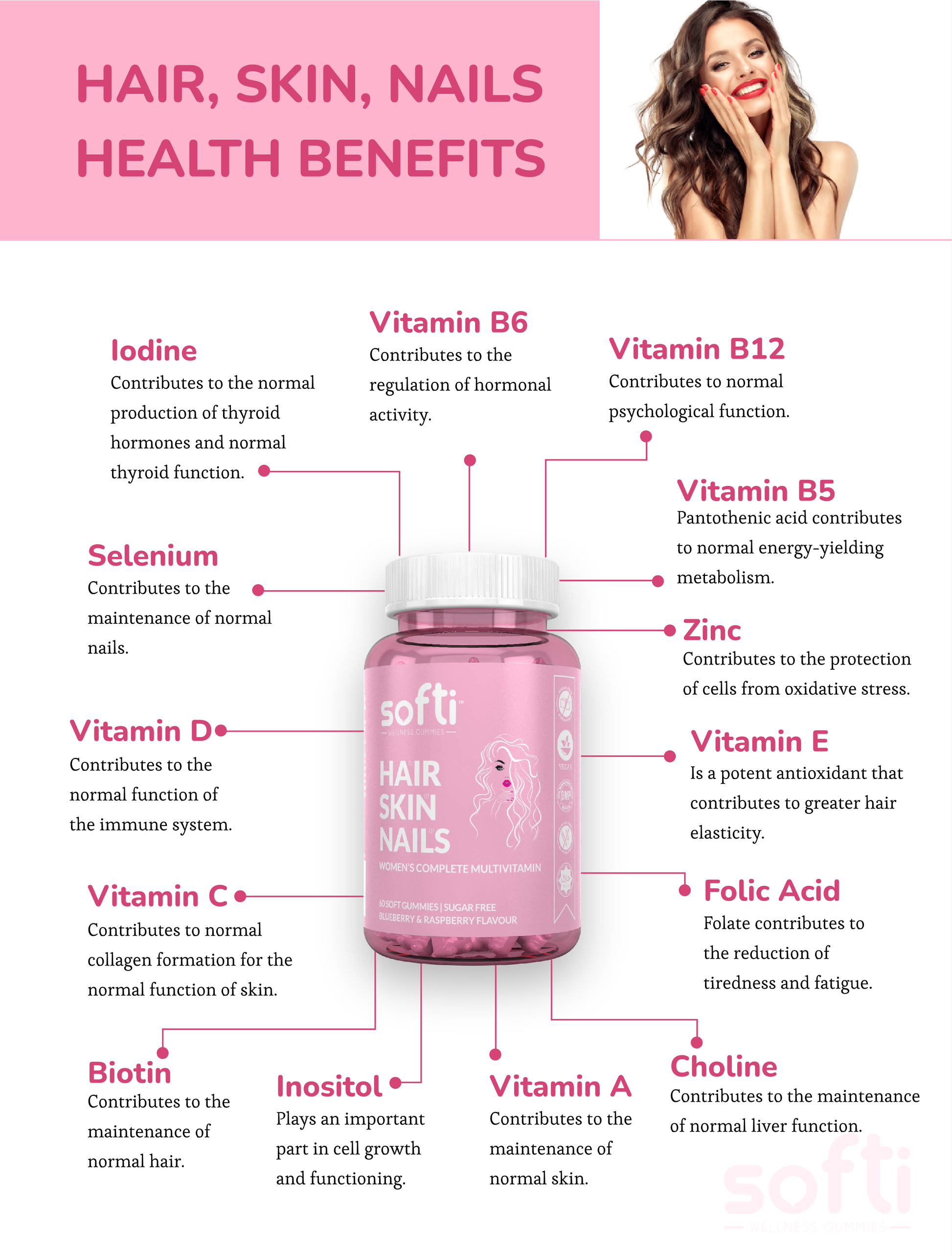 We have therefore created complete multivitamin gummies that contain a variety of beauty-enhancing ingredients, including biotin, vitamins, and minerals, that help promote beautiful hair, stronger nails, and glowing skin.